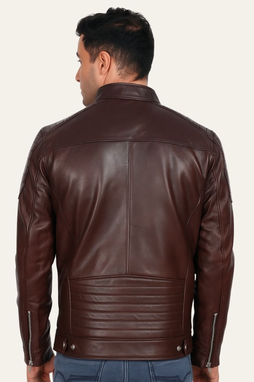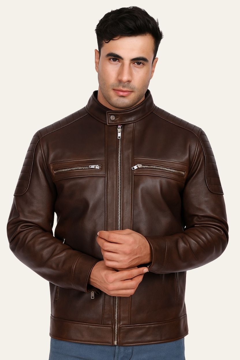 Dark brown leather offers a warm and sophisticated alternative to black, providing a timeless look that pairs perfectly with various wardrobe styles. This jacket is ideal for men seeking a balance between ruggedness and refinement. It complements earth tones and works seamlessly with denim, chinos, and boots.